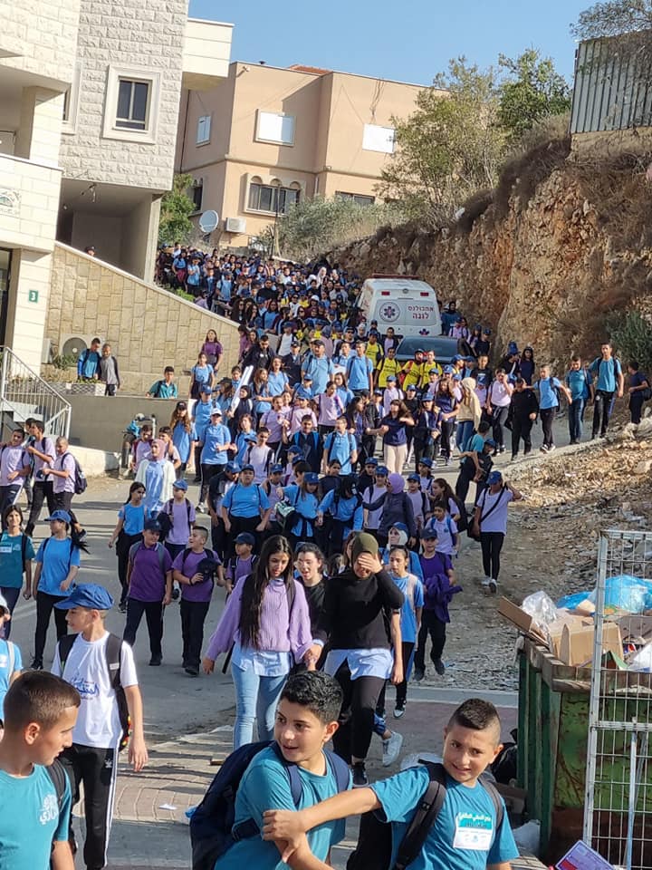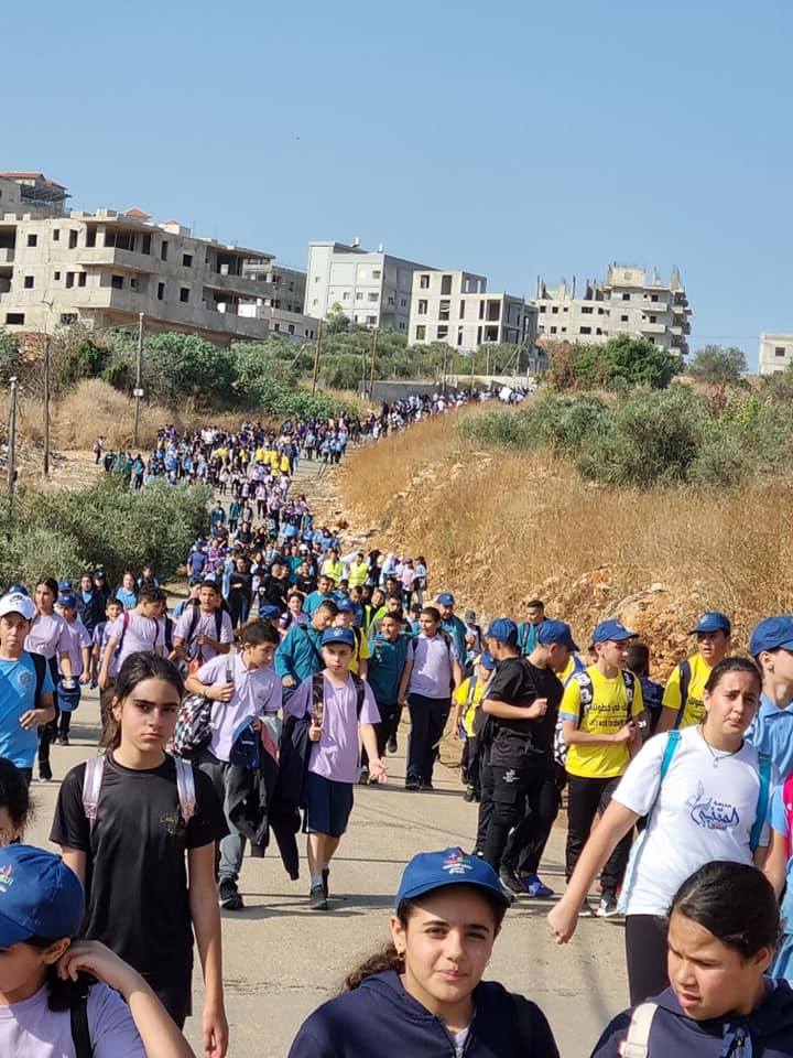 بعد ذلك كانت فعالية احماء للمرشدة مريم عويدات، ومن ثم انطلق أكثر من ألف طالب وطالبة بمرافقة العديد من الاهالي والمعلمين باتجاه متنزه سويسة مرورًا بحي الظهر باتجاه شارع القدس حتى دوار العيون نزولًا بالشارع الموصل الى حي سويسة حيث كانت الفعالية الاختتامية في متنزه سويسة.